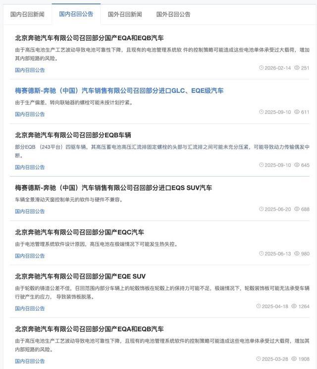 电车通从「中国汽车召回网」查询到,奔驰EQ系列是召回的常客,今年2月份就因为高压电池生产工艺问题,导致部分车辆存在起火风险,共召回19481辆奔驰EQA和奔驰EQB。