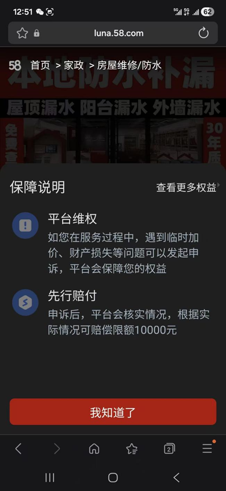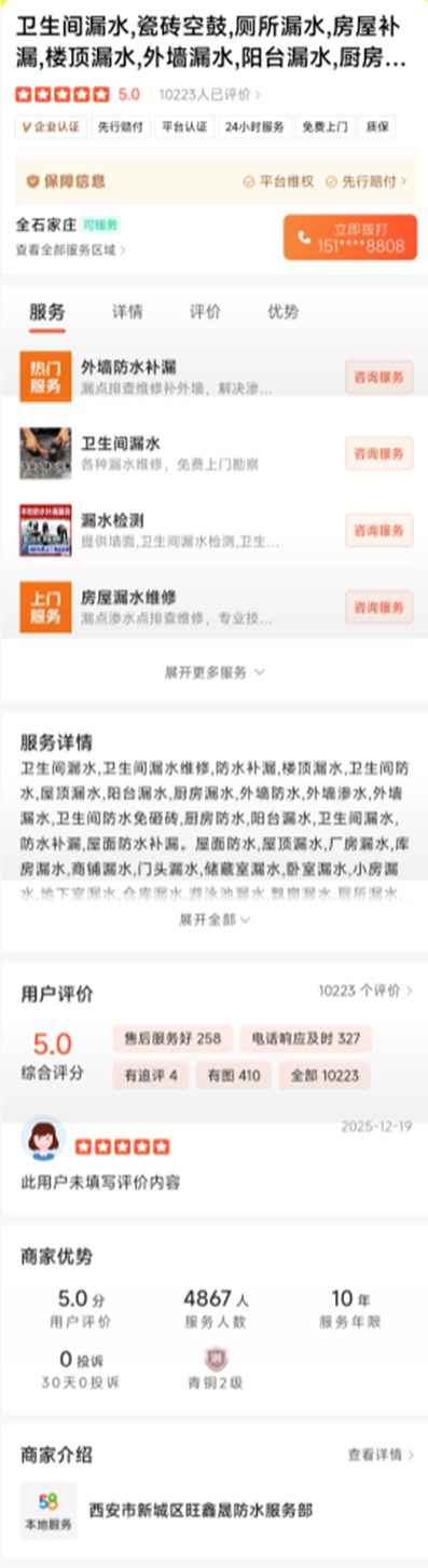 据消费者于先生投诉,2025年9月,其因卫生间渗水问题,通过58同城网页联系到一家防水公司。在看到平台页面上对该公司的“V企业认证”及“服务保障”信息后,于先生与对方达成施工意向,并在施工结束后支付1900元费用。