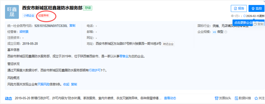 在后续维权过程中,争议逐渐从单一施工纠纷延伸至平台审核与保障责任问题。据调查,涉事商家被认定是“异地挂牌空壳”公司,在当地无人员、无场地,且早在2021年已被列入经营异常名录。