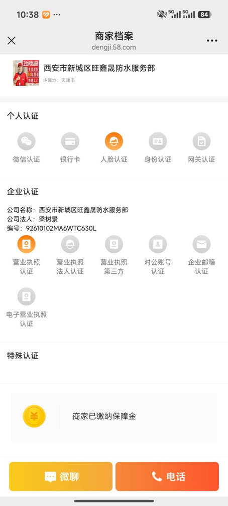 记者查询注意到,虽然涉事商家在天眼查APP显示为“经营异常”,但58同城网页显示,涉事商家通过营业执照和人脸视频在58同城获得认证,“商家已缴纳保障金”,已获10233人评价,目前仍可正常接单。